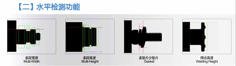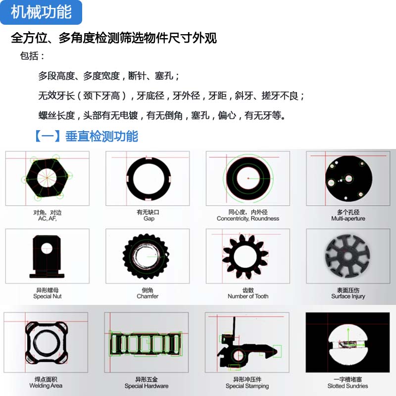 • 本系統檢測功能包括多段高度、多度寬度,斷針、塞孔,無效牙長(頸下牙高),牙底徑,牙外徑,牙距,斜牙、搓牙不良,螺絲長度,頭部有無電鍍,有無倒角,塞孔,偏心,有無牙